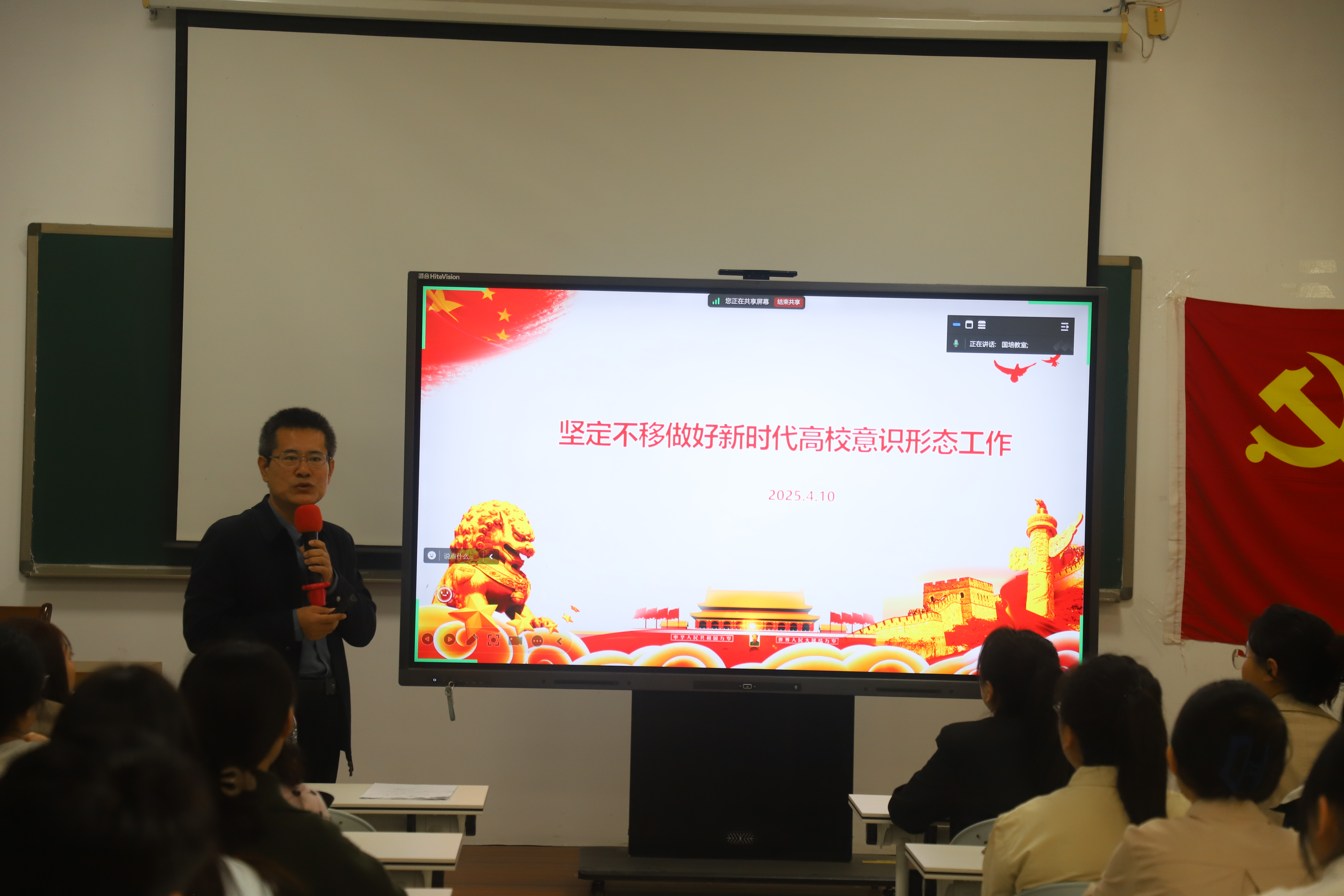 4月10日下午,数学科学学院在学院一楼国培教室举办学生党员大会,学院党委副书记顾连忠以“坚定不移做好新时代高校意识形态工作”为题讲党课,学院全体学生党员和本学期参加党课培训的入党积极分子190余人在线上线下参加了会议。